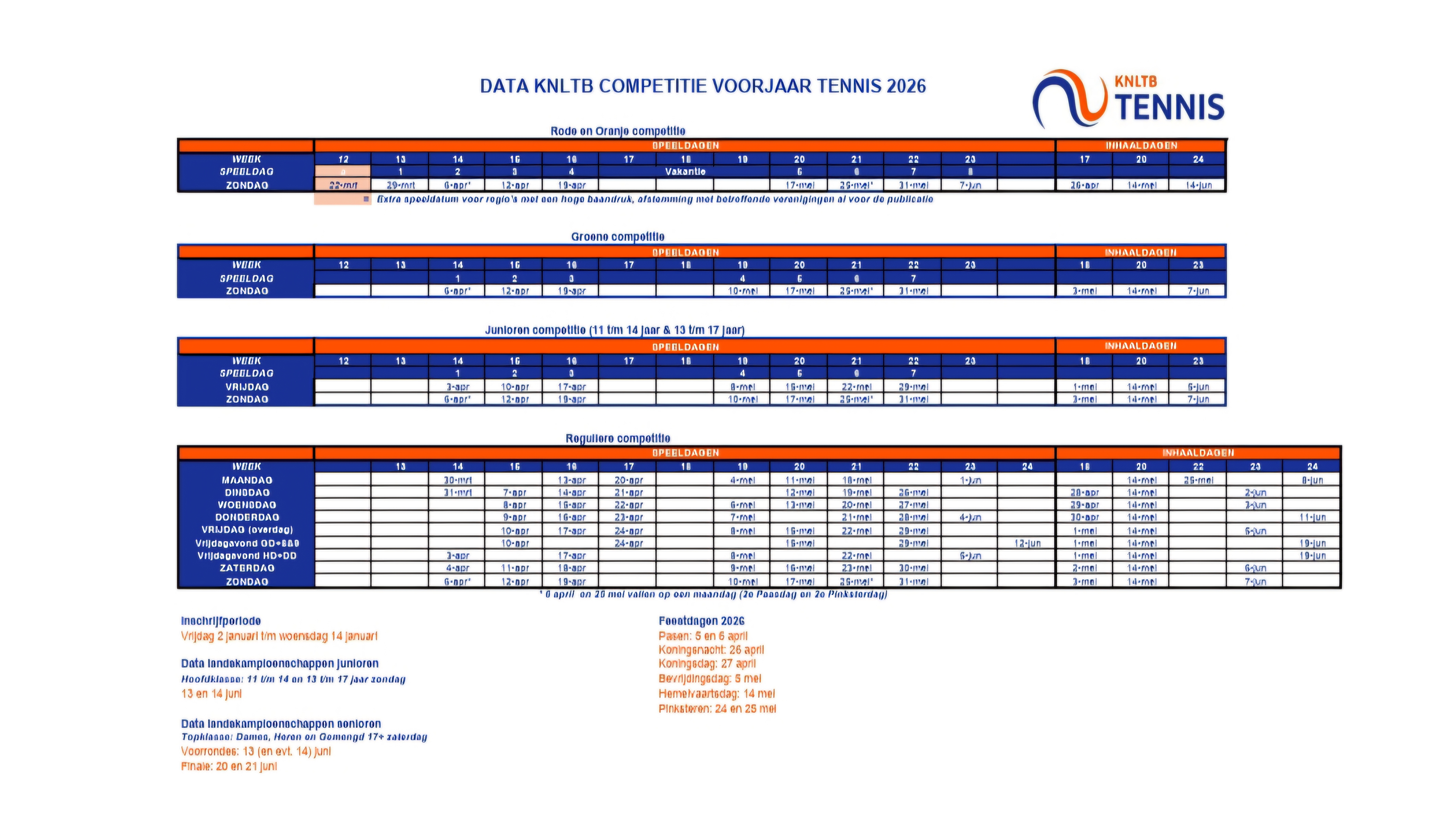 Door nu al de competitiedata in je agenda te zetten en rekening te houden met mogelijke speeldagen, helpen we elkaar om straks goed voorbereid aan de competitie te beginnen en verrassingen te voorkomen.