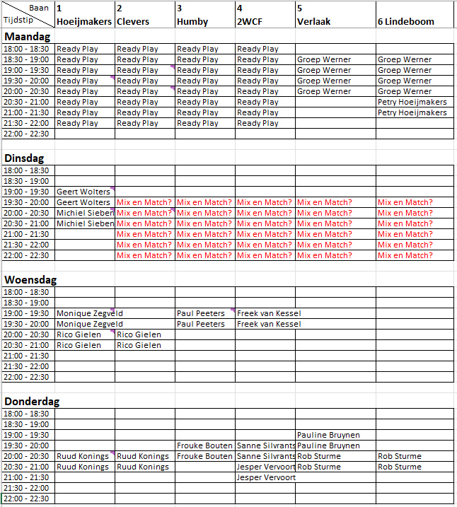 Bijgevoegd vinden jullie het schema van de vaste baanreserveringen.